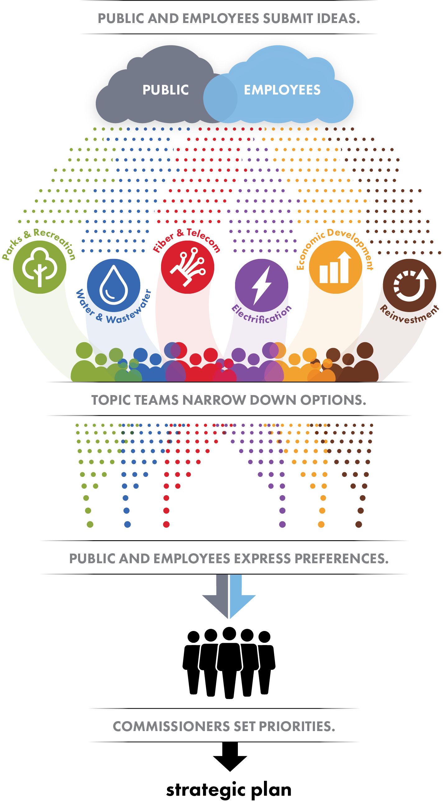 The PUD conducted more than 25 personal interviews with trusted community leaders and held 40 community meetings with different civic organizations around the county. Internally, PUD committees and staff also deployed a variety of employee engagement strategies.